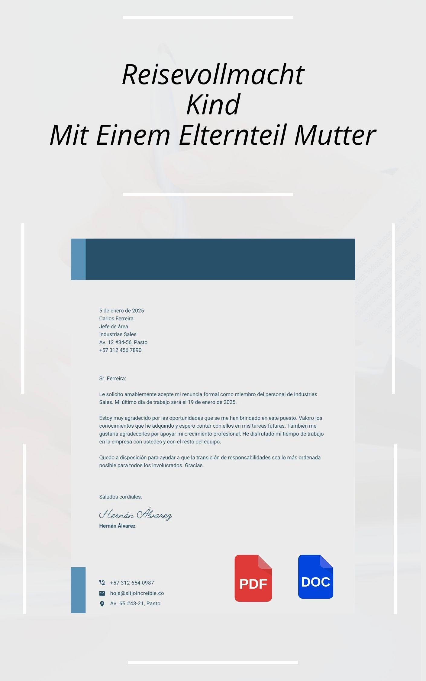 Antwort: Eine Reisevollmacht ist ein schriftliches Dokument, das von der Mutter des Kindes ausgestellt wird, um die Einwilligung und Zustimmung zur Reise des Kindes mit nur einem Elternteil zu geben.