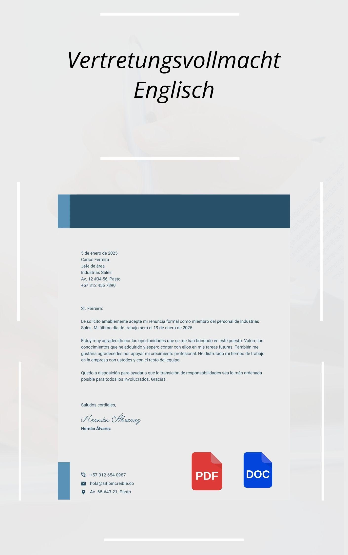 - Der Vollmacht Vertretungsvollmacht Englisch ist besonders hilfreich bei der Zusammenarbeit mit Geschäftspartnern, die kein Deutsch sprechen.