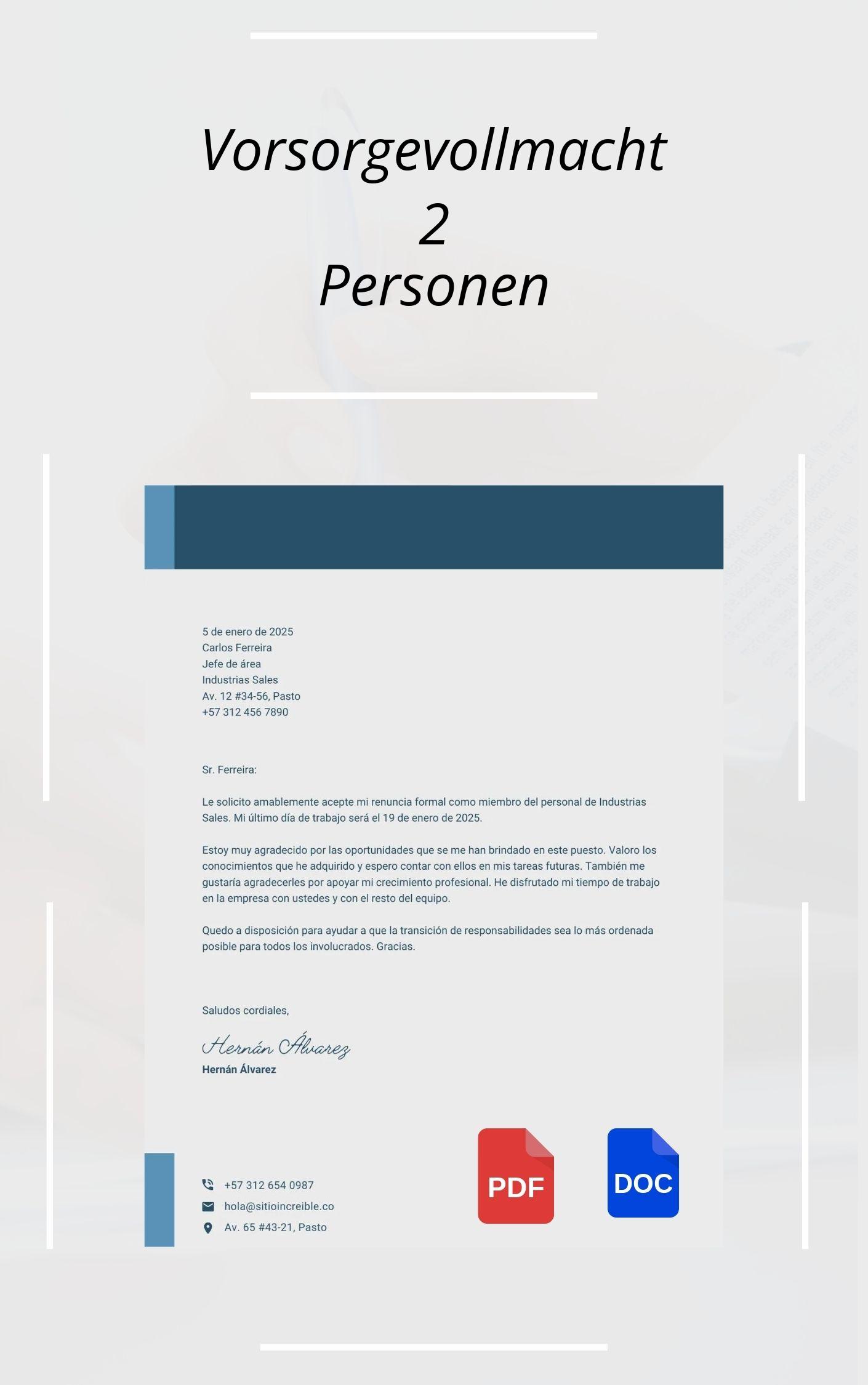 - Dr. Katharina Müller, Notarin: Die Vollmacht Vorsorgevollmacht 2 Personen ist eine innovative Lösung, um sicherzustellen, dass im Falle einer Geschäftsunfähigkeit beide bevollmächtigten Personen gemeinsam handeln können. Dies ist besonders relevant, um die Interessen des Vollmachtgebers bestmöglich zu wahren.