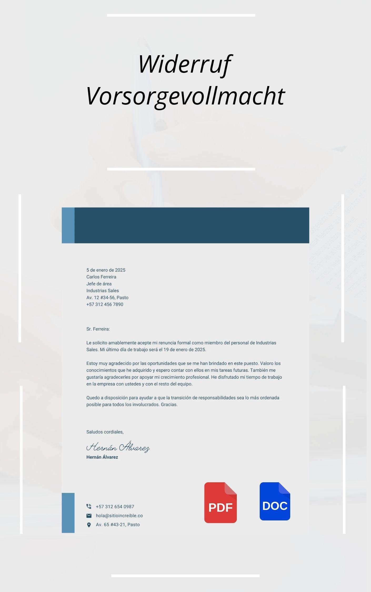 Um einen widerruflichen Vorsorgevollmacht zu widerrufen, können Sie ein formloses Schreiben verwenden, das Ihren Widerruf klar und eindeutig zum Ausdruck bringt. Das Schreiben sollte den vollständigen Namen des Bevollmächtigten, das Datum der ursprünglichen Vollmachterteilung und das Datum des Widerrufs enthalten. Um sicherzustellen, dass der Widerruf wirksam ist, können Sie das Schreiben auch von einem Anwalt überprüfen lassen.